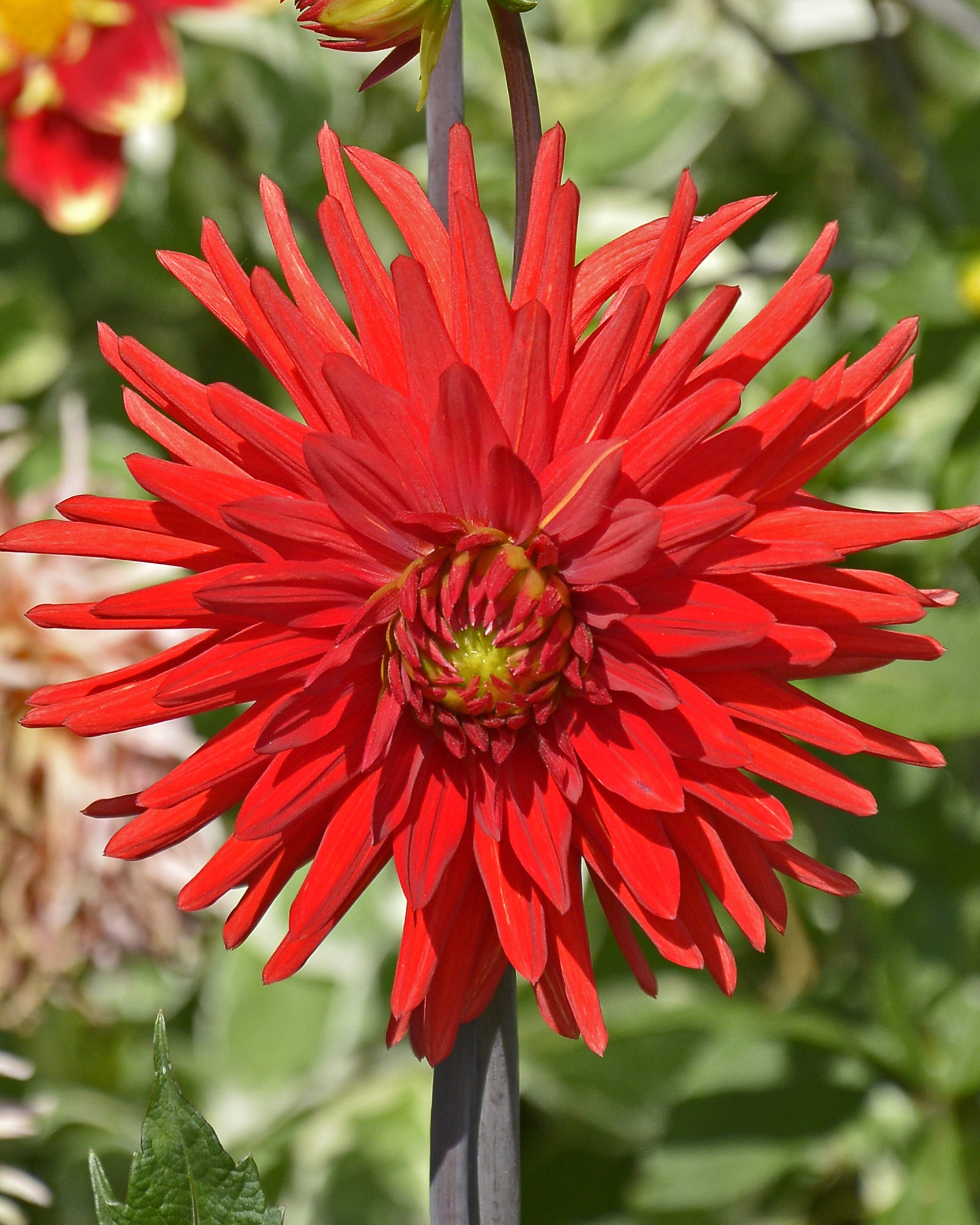 A Dahlia 'Bergers Record' in full bloom is a sight to be reckoned with –and remembered. These medium-sized semi-cactus flowers look like a closely gathered group of mini-explosions. Their bright red spikey and tubular petals seem to radiate the effects of these little blasts, sending their brightness out into the whole area surrounding the plant. The green foliage behind the flowers, being red’s complementary colour, further highlights the impact of these stunning flowers. Enjoy Dahlia 'Bergers Record' in your garden from mid to late summer or cut them for indoor display. Others will bloom to replace those you’ve cut!