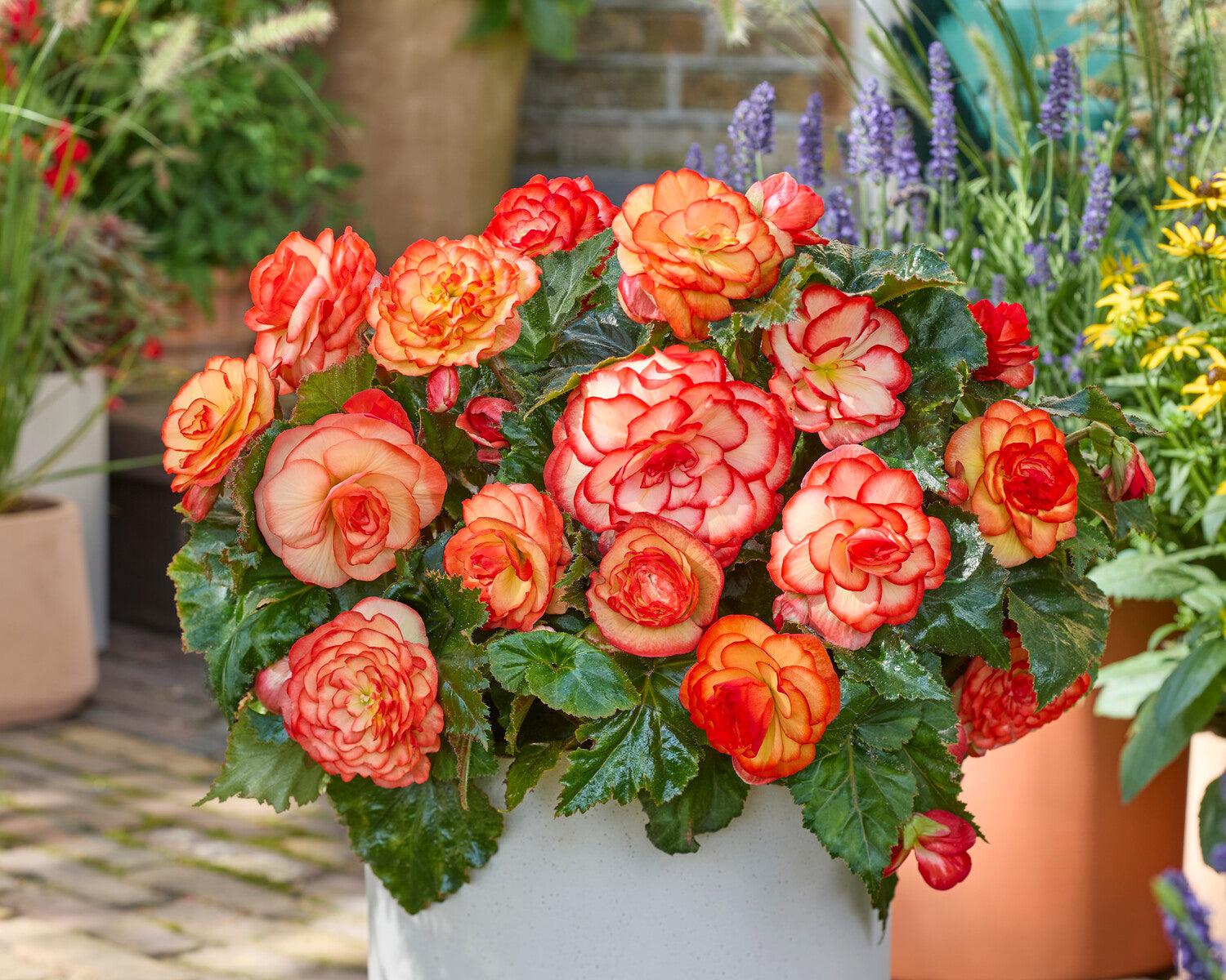 Begonia 'Wummi Maskerade' lives up to its theatrical name with a floral display worthy of the spotlight. Each large, double bloom appears dressed for a summer masquerade—petals in soft shades of cream, ivory and buttery yellow, all edged delicately in red, as if touched by a makeup artist’s brush. The effect is wonderfully refined yet full of character, and when the blooms catch the light, they seem to glow from within. Set against rich green foliage, Begonia 'Wummi Maskerade' brings a sense of elegance and intrigue to any pot, basket or border, turning even the simplest planting scheme into a stage for colour and form.