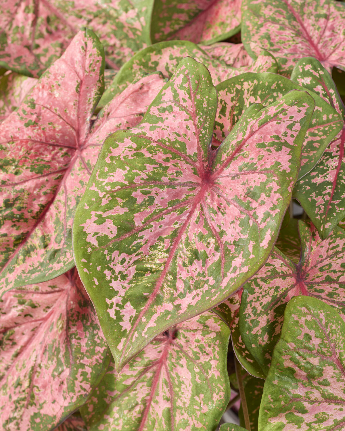 With its whimsical display of delicate heart-shaped leaves, Caladium 'Pink Beauty' is sure to be the new object of your affections. The myriad of watermelon-pink hues, defined with intricate fuchsia veining, sweet blushes of strawberry-coloured speckles and blotchy green freckles, it’s quite the cocktail of colour. The curiously-shaped, knobbly bulbs of Caladium 'Pink Beauty' have multiple growing points, meaning each bulb will produce a mass of luscious leaves over the season, unfurling into a plant with a fulsome habit. Caladiums have enjoyed a boom in popularity recently, becoming a favourite of houseplant enthusiasts everywhere. But they don’t have to be confined to indoors—once the weather’s warm enough in summer they can be transferred into the garden where they’ll bring lush colour to shaded spaces!