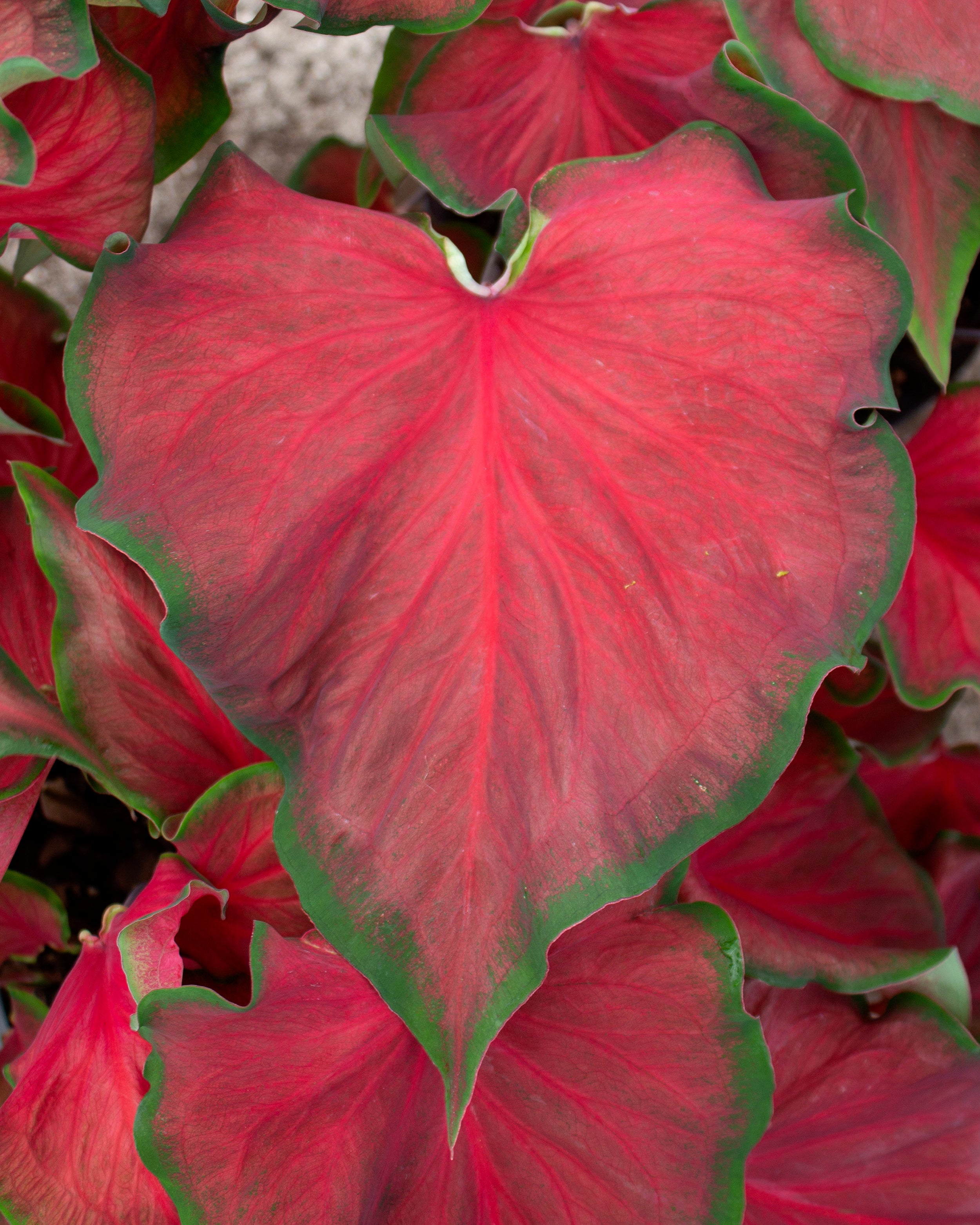 Caladium 'Red Ruffles' flaunts a flamboyant personality that’s impossible to ignore. Its glossy, intense red leaves ripple and shimmer as they catch the light, each framed with a crisp green border that gives Caladium 'Red Ruffles' a polished, sculptural look. This tropical-inspired beauty forms neat rosettes, making it perfect for drawing the eye in containers, patio pots, or shady garden corners. Whether you place it alone or among more subdued foliage, Caladium 'Red Ruffles' commands attention, proving that bold colour can also be refined.