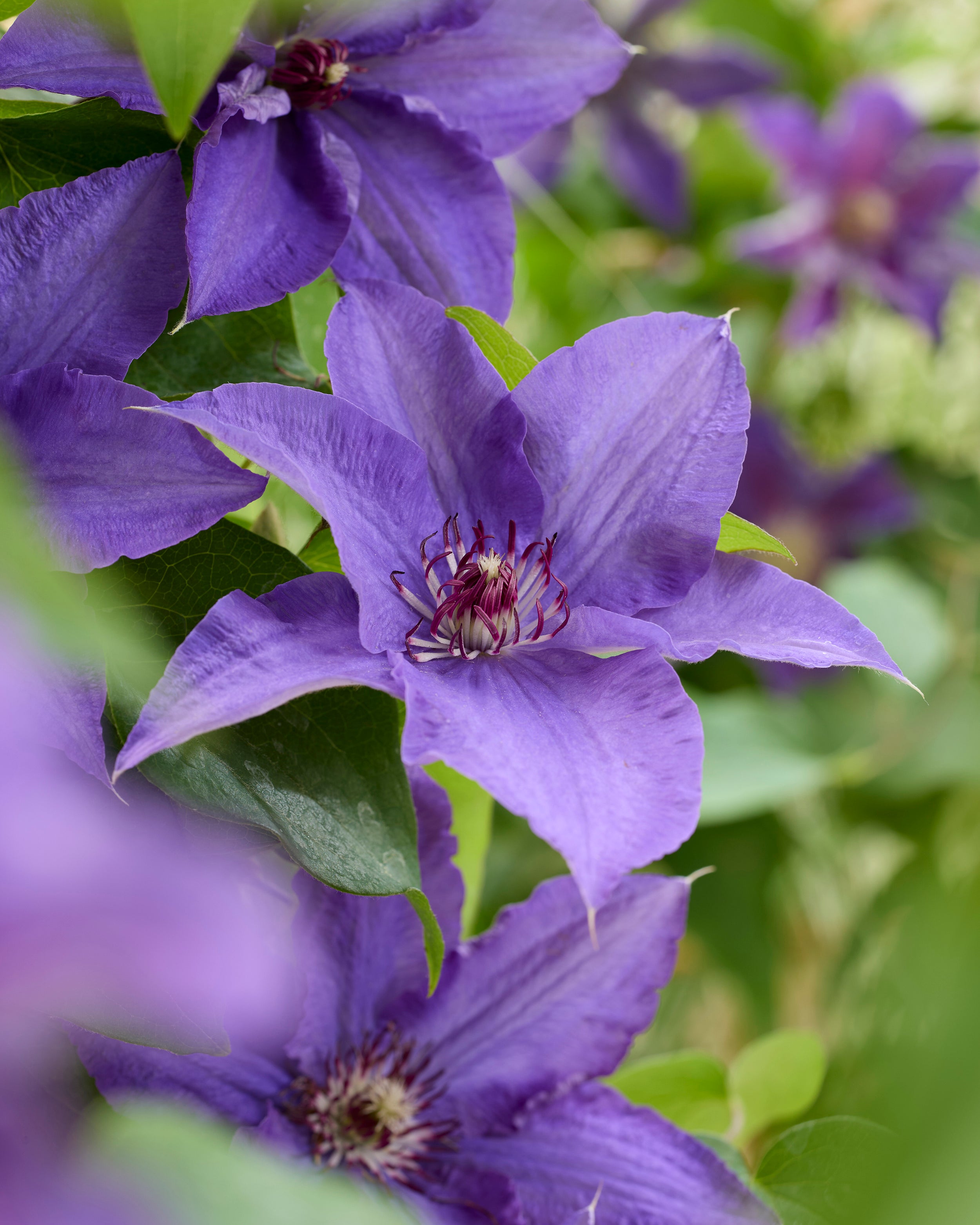 Clematis 'Lindsay' is a striking addition to any garden, offering dramatic, star-shaped flowers in a deep purple-blue that seem to glow against its mid-green foliage. Introduced at the 2024 RHS Chelsea Flower Show, this leather flower immediately caught the eye of gardeners and designers alike. Each bloom, measuring up to 15cm across, is accented with vivid red anthers, adding a playful pop of colour and making Clematis 'Lindsay' a true statement climber for trellises, fences, and pergolas.