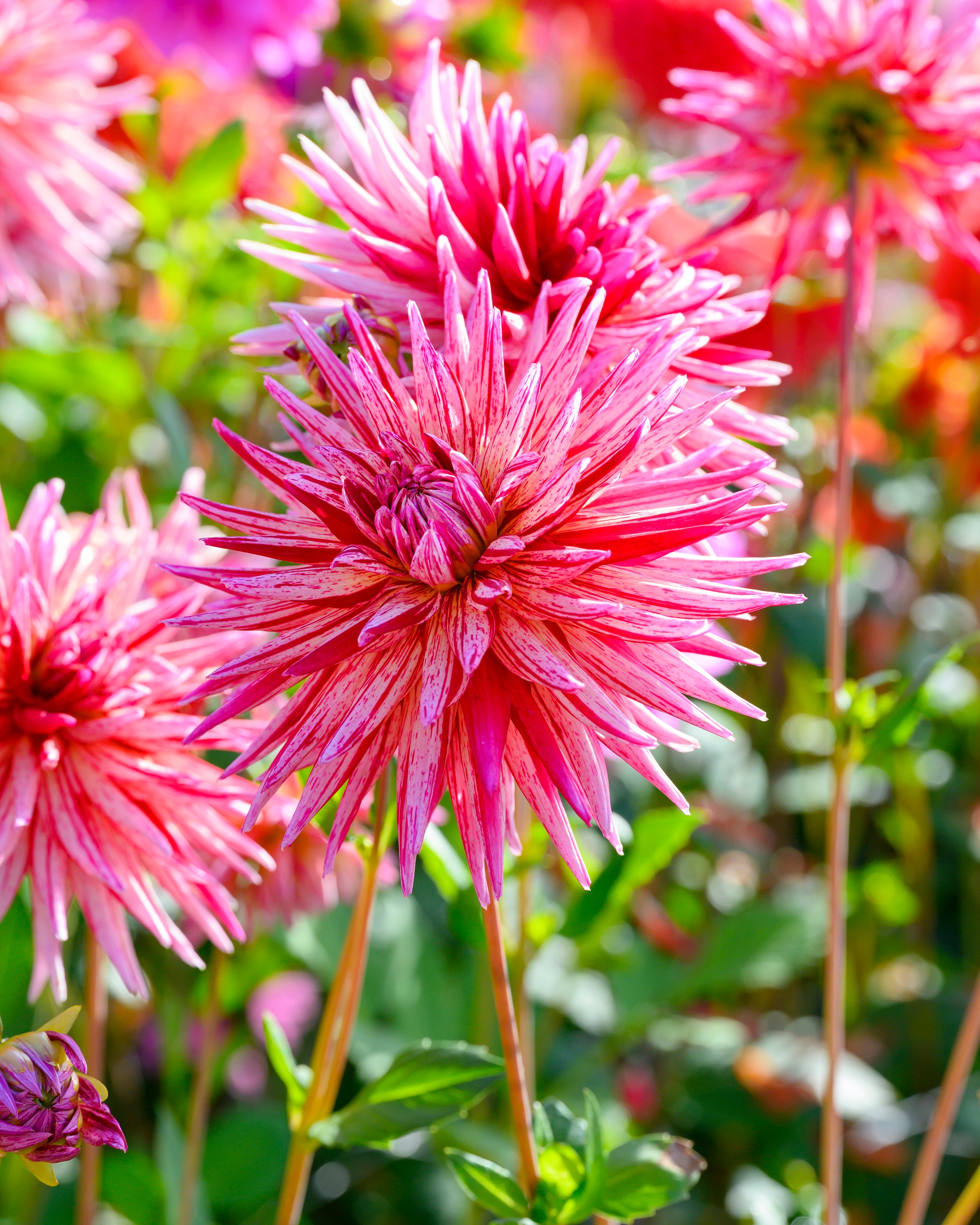 Dahlia 'Alain Mimoun' has a sense of motion built into its very form. Its cactus-style blooms burst with narrow, spiky petals in white and glowing red-pink, flecked and streaked with red like embers caught in a breeze. The flowers of Dahlia 'Alain Mimoun', held high on strong stems, bring energy and exuberance wherever they appear. Flowering from midsummer to autumn, it provides endless material for cut arrangements.