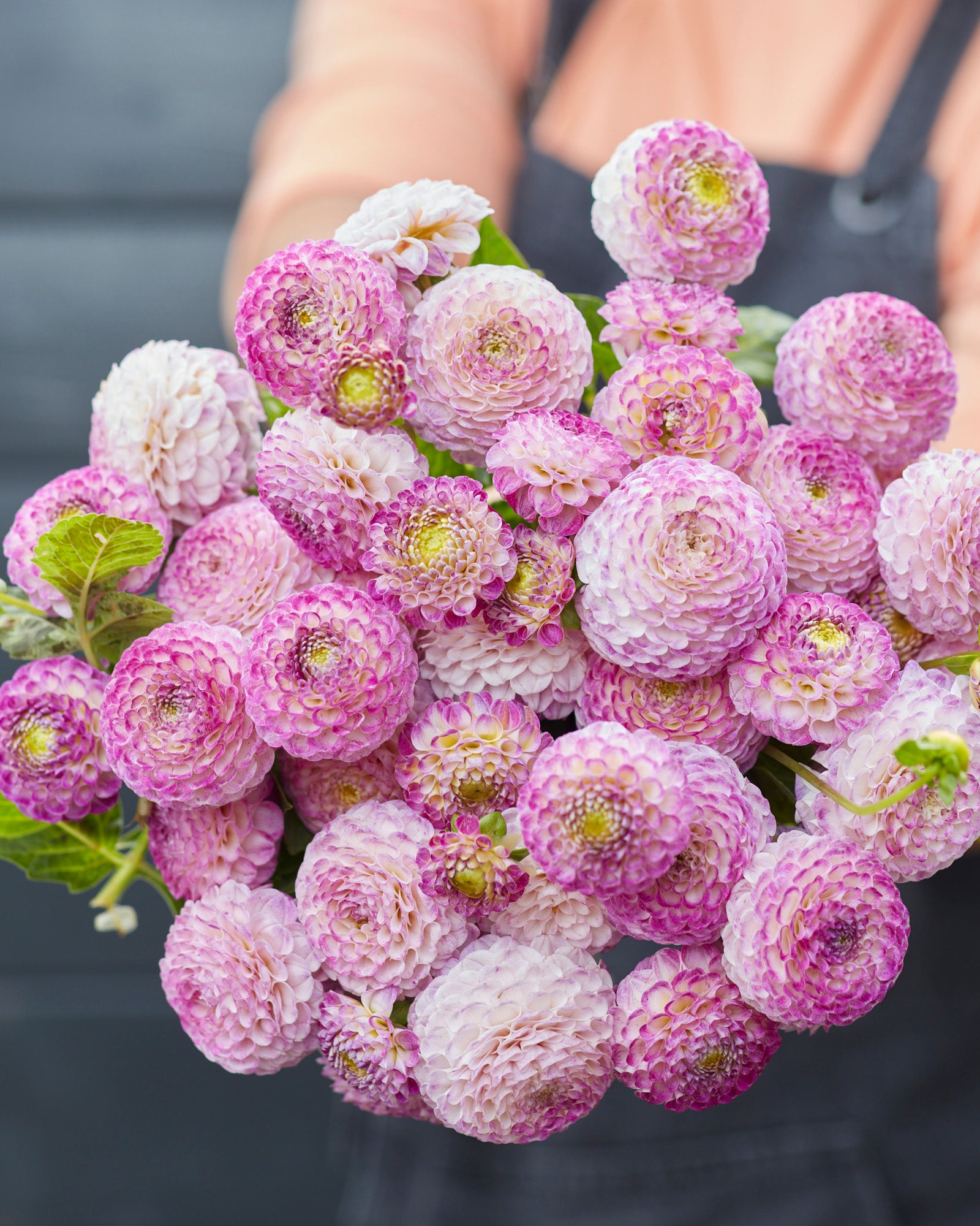 Cheerful and delightfully rotund, Dahlia 'Ping Pong' is a pompon dahlia with perfectly spherical blooms that really do resemble its namesake. Each ball-shaped flower is an intricate blend of creamy ivory and pink-cerise, the petals tightly layered in seamless harmony. Dahlia 'Ping Pong' is a wonderfully tactile flower that invites closer inspection, every blossom as neatly engineered as a Victorian button.