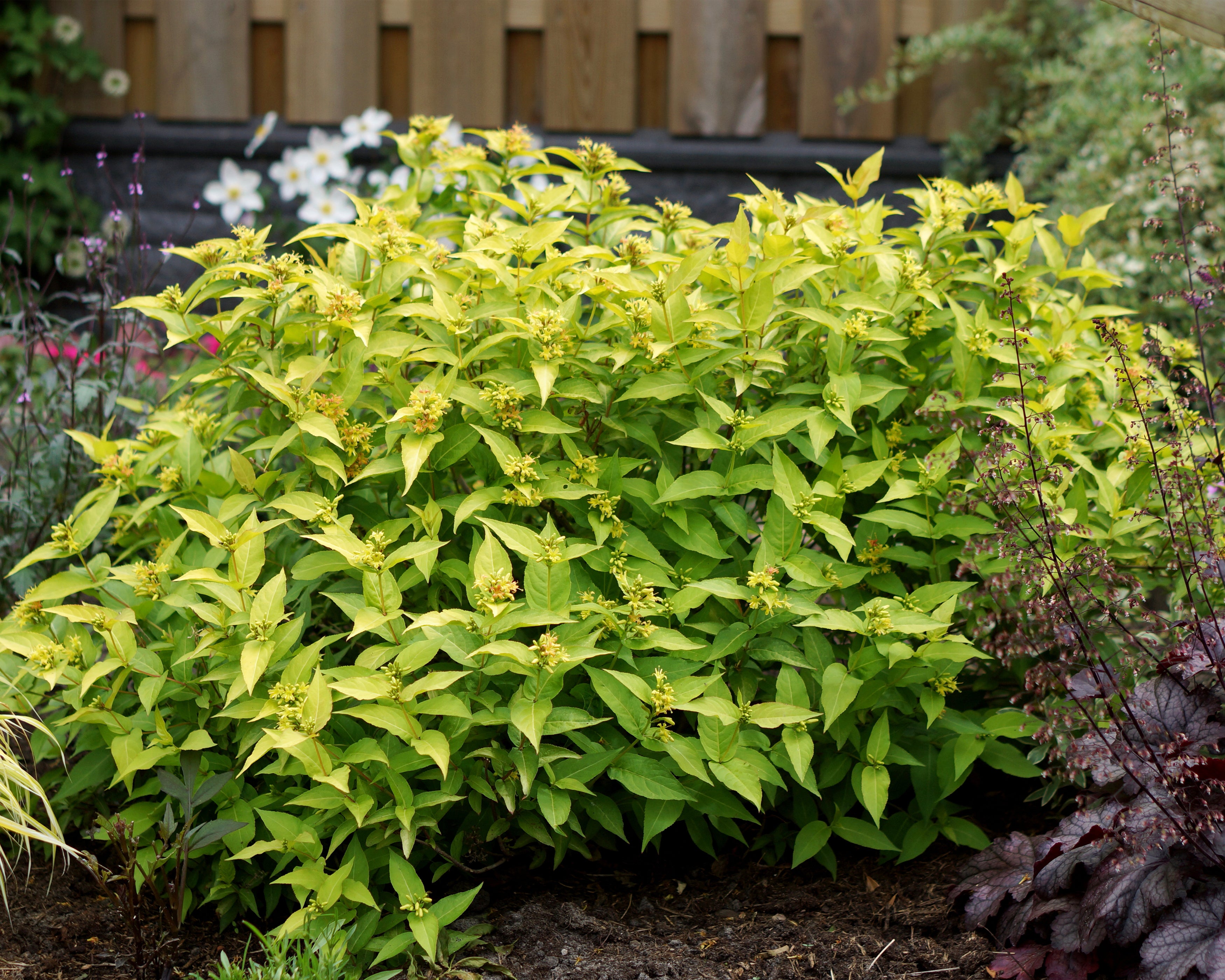 Diervilla 'Honeybee' is the sort of shrub that lives up to its name with a flourish. From the moment its foliage emerges in spring, the leaves glow in a vivid, lemony yellow that seems to catch the light at every angle. This golden backdrop becomes even more dazzling when midsummer arrives and the plant produces clusters of golden-yellow flowers that seem to hum with life. Rich in nectar, these blooms are a magnet for bees, butterflies, and other pollinators, making Diervilla 'Honeybee' a natural choice for anyone hoping to inject both colour and biodiversity into their planting schemes.