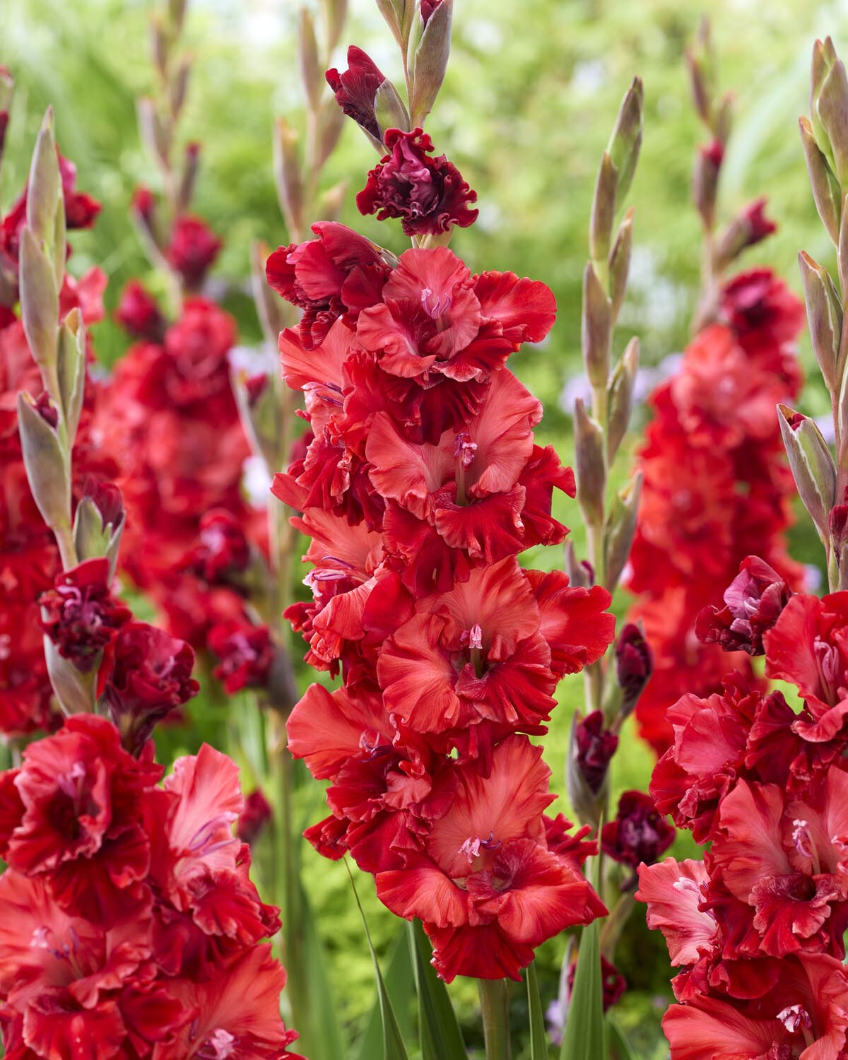As striking in the vase as it is in the garden, Gladiolus 'Velvet Raspberry' makes an exceptional cut flower, its blooms lasting well and arranging beautifully alongside dahlias, roses and late-summer perennials. Plant the corms in succession for a continuous display from midsummer into early autumn, and enjoy a show that feels both timeless and dramatic. Whether standing tall in a sunny border or gathered in elegant arrangements indoors, Gladiolus 'Velvet Raspberry' delivers pure, luxurious red colour at every turn.