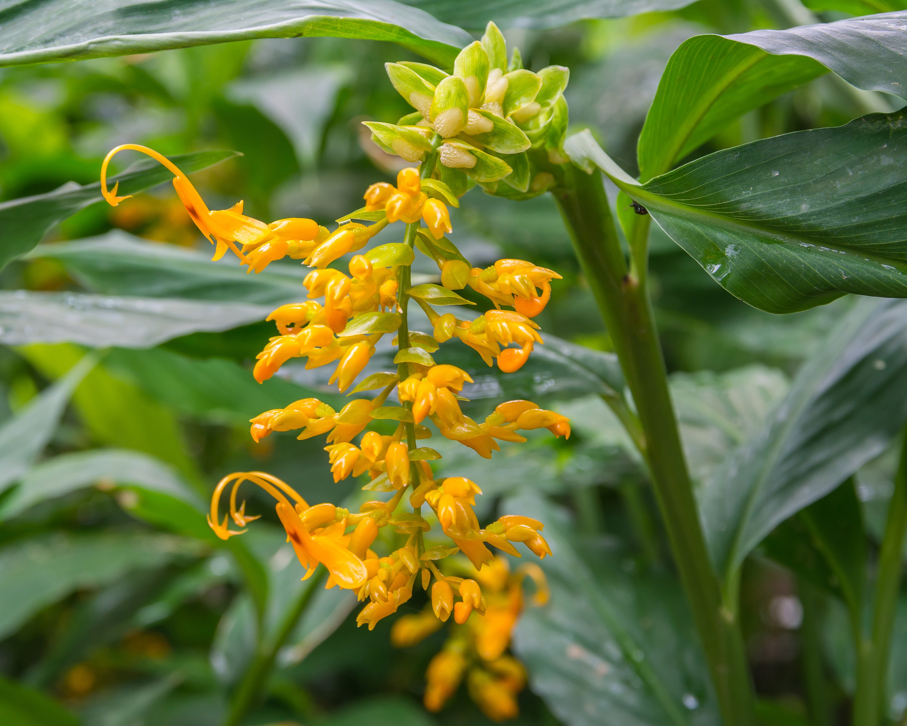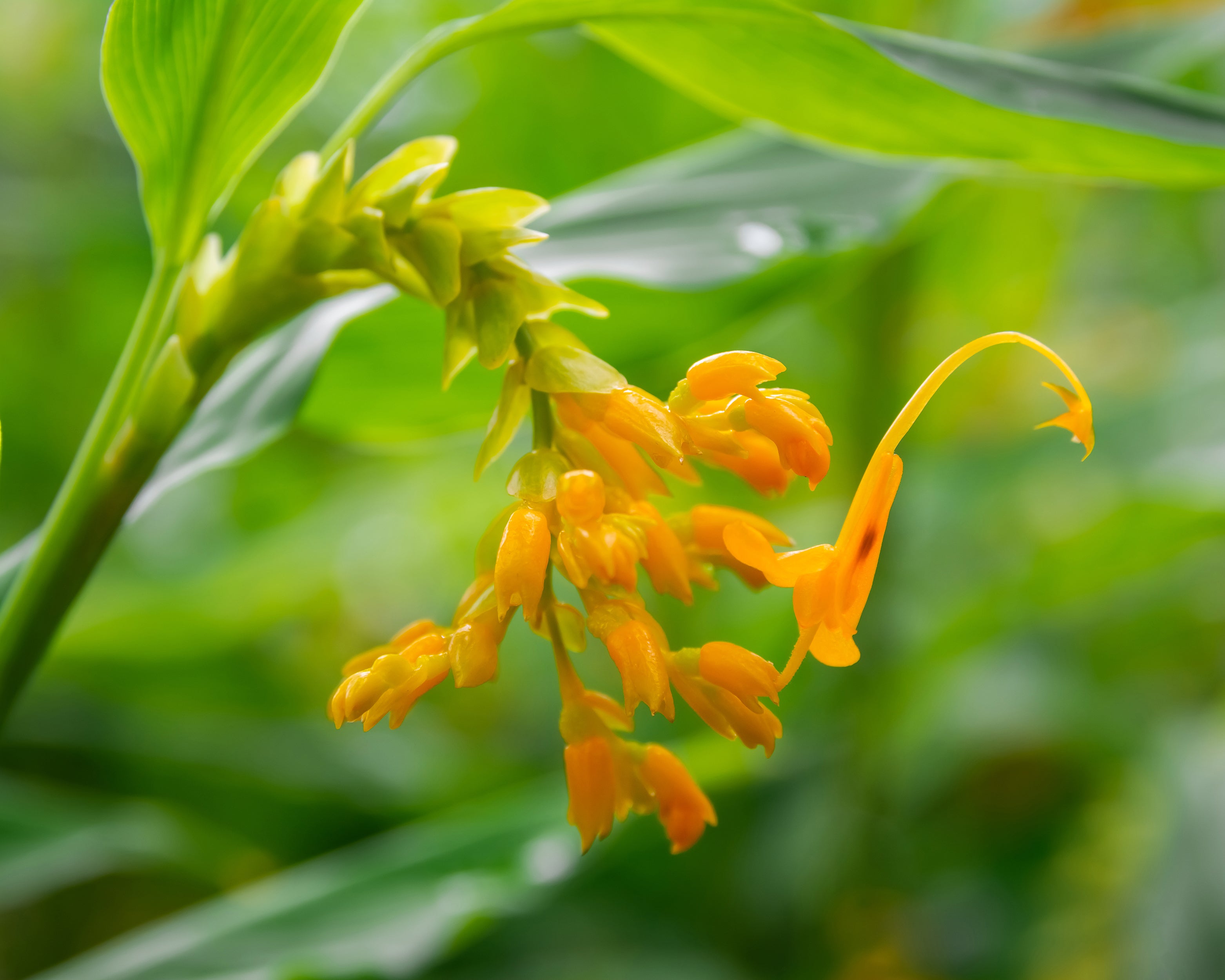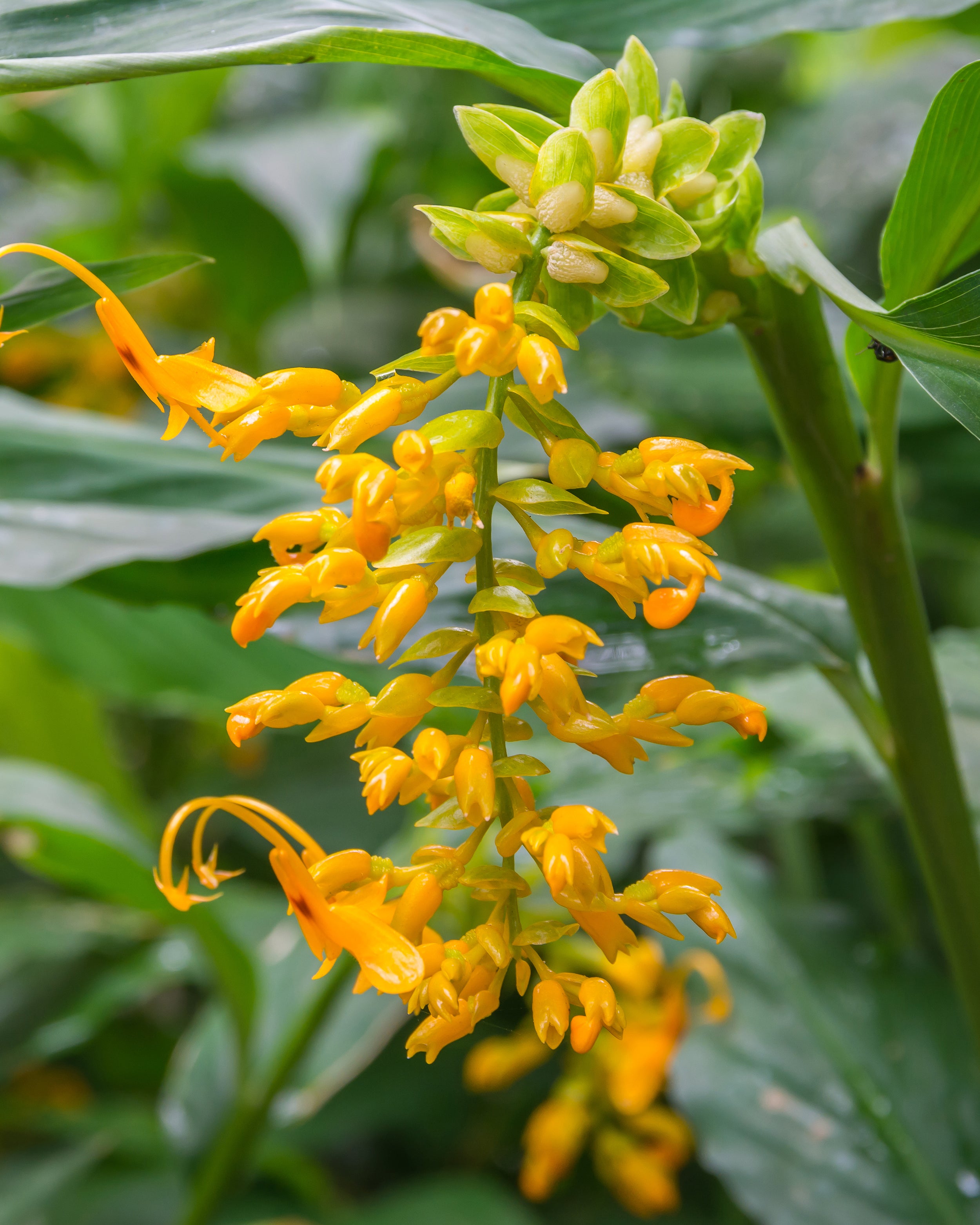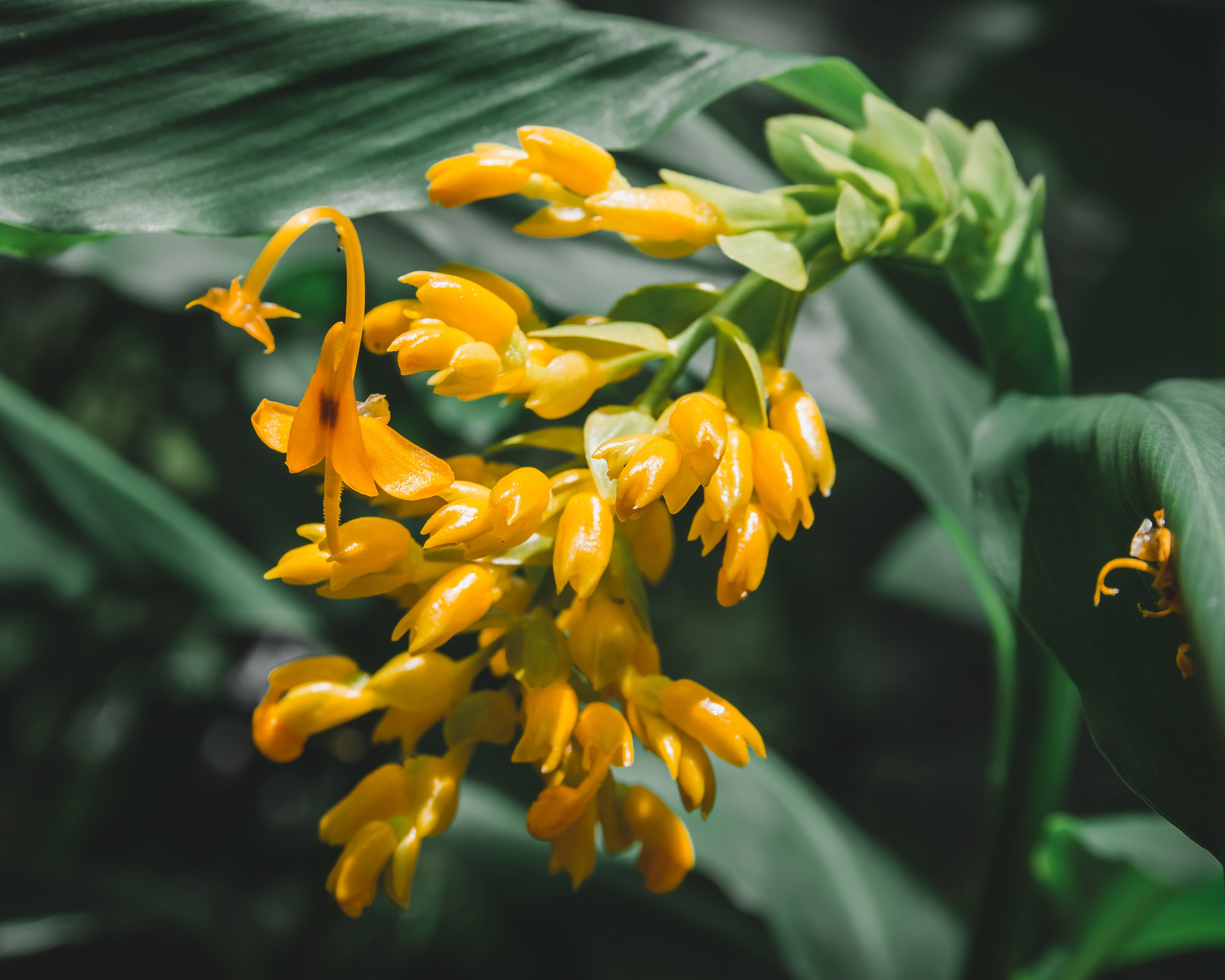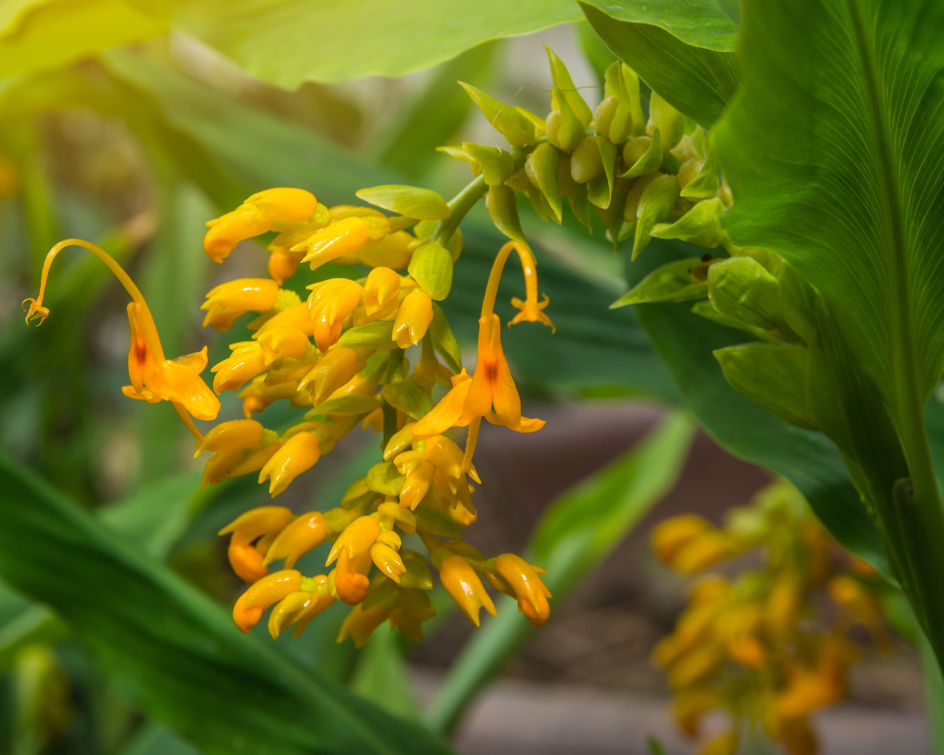 Globba is called dancing ladies ginger because its delicate, hanging blooms resemble tiny ladies in yellow skirts twirling gracefully in midair.