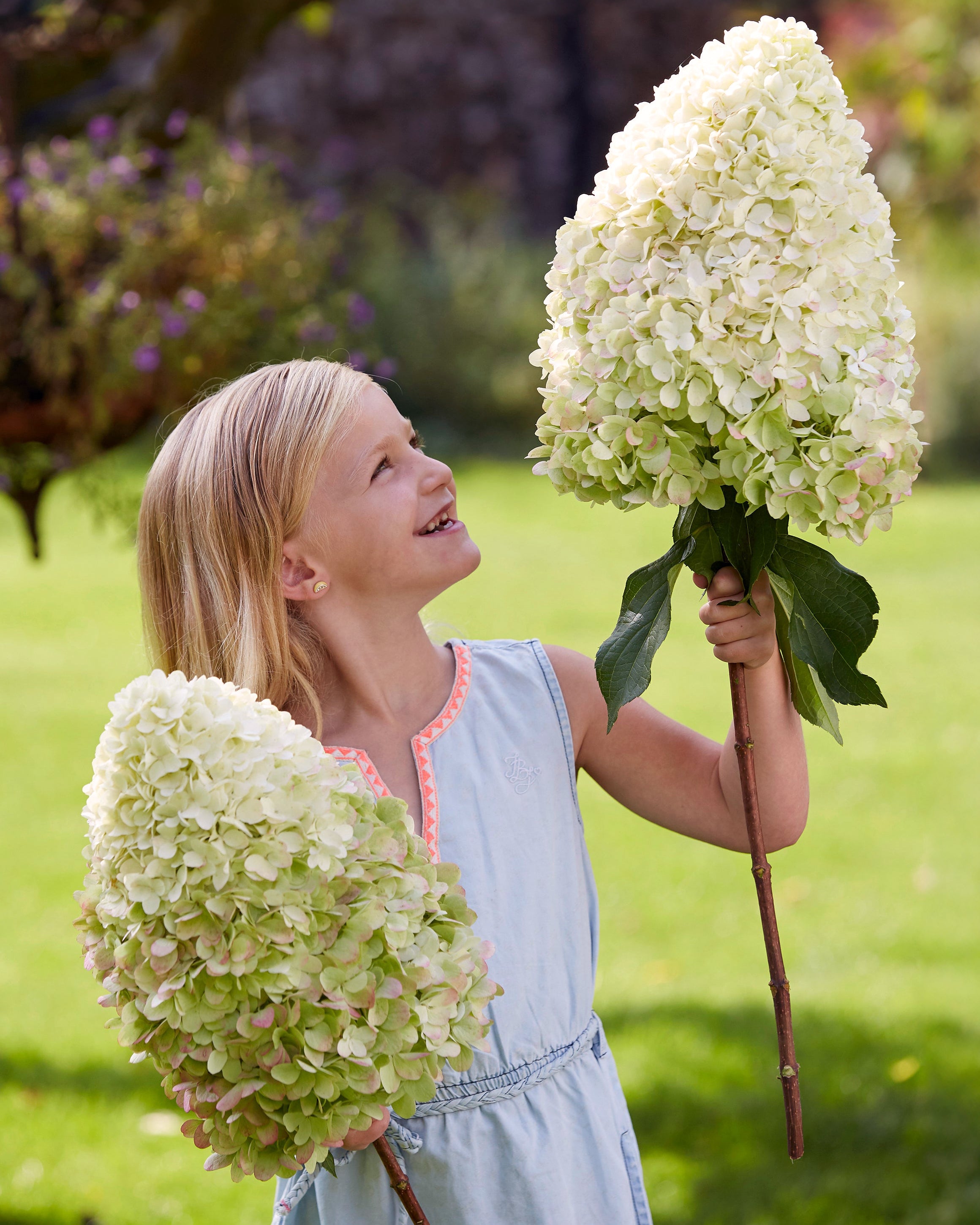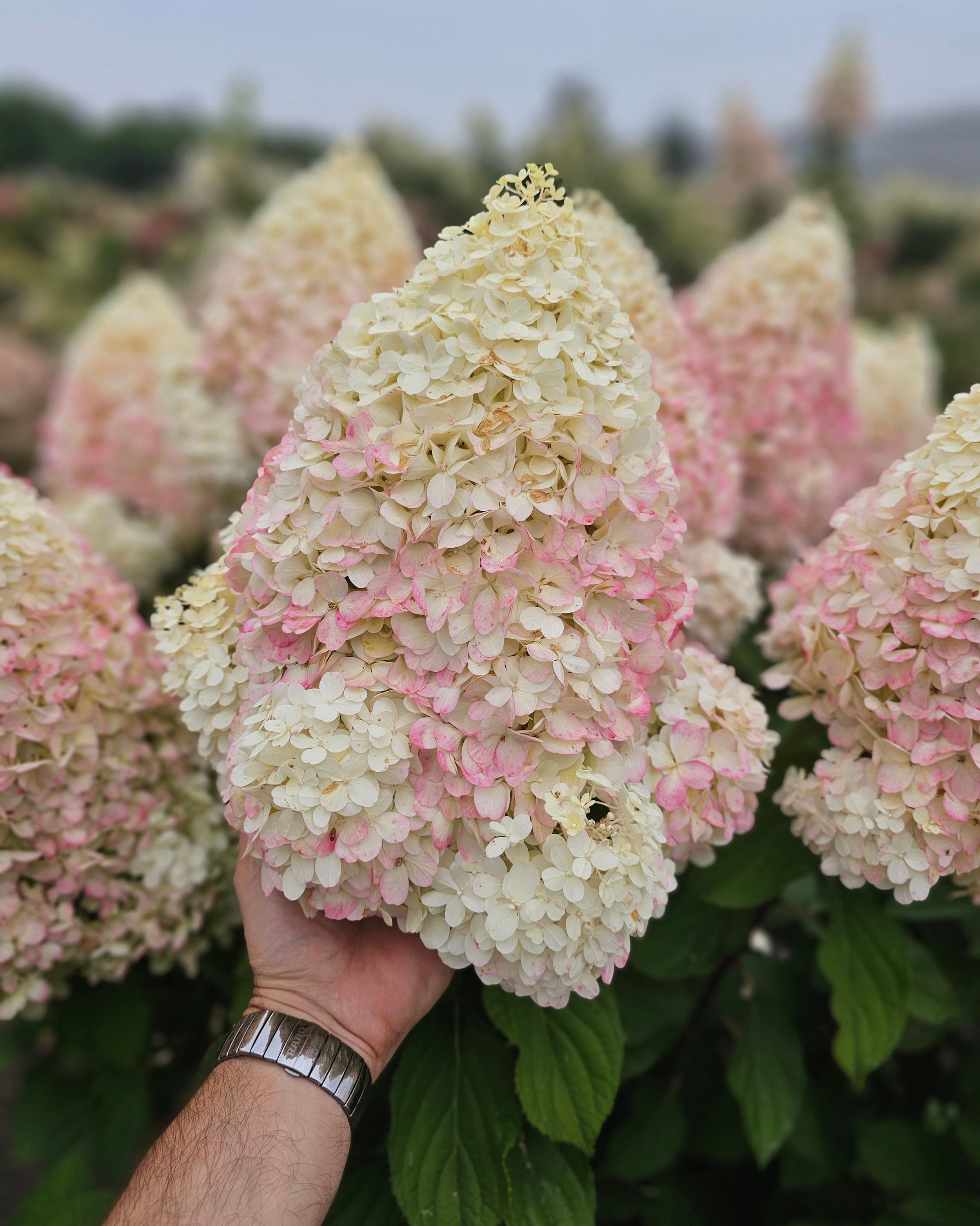 Hydrangea 'Hercules' lives up to its name with towering, panicle-shaped blooms that command attention from summer right through to autumn. This giant panicled hydrangea produces flower heads up to 40cm across, starting as crisp white-green and gradually developing a delicate rosy blush as the season progresses. Hydrangea 'Hercules' has a robust, upright habit, growing to around 1.5–2 metres in height and spread, making it a show-stopping feature in borders, patios, or even as a focal point in larger gardens. Each bloom of Hydrangea 'Hercules' seems to defy gravity, adding drama and elegance in equal measure, while the soft blush tones bring a gentle warmth to the greenery.