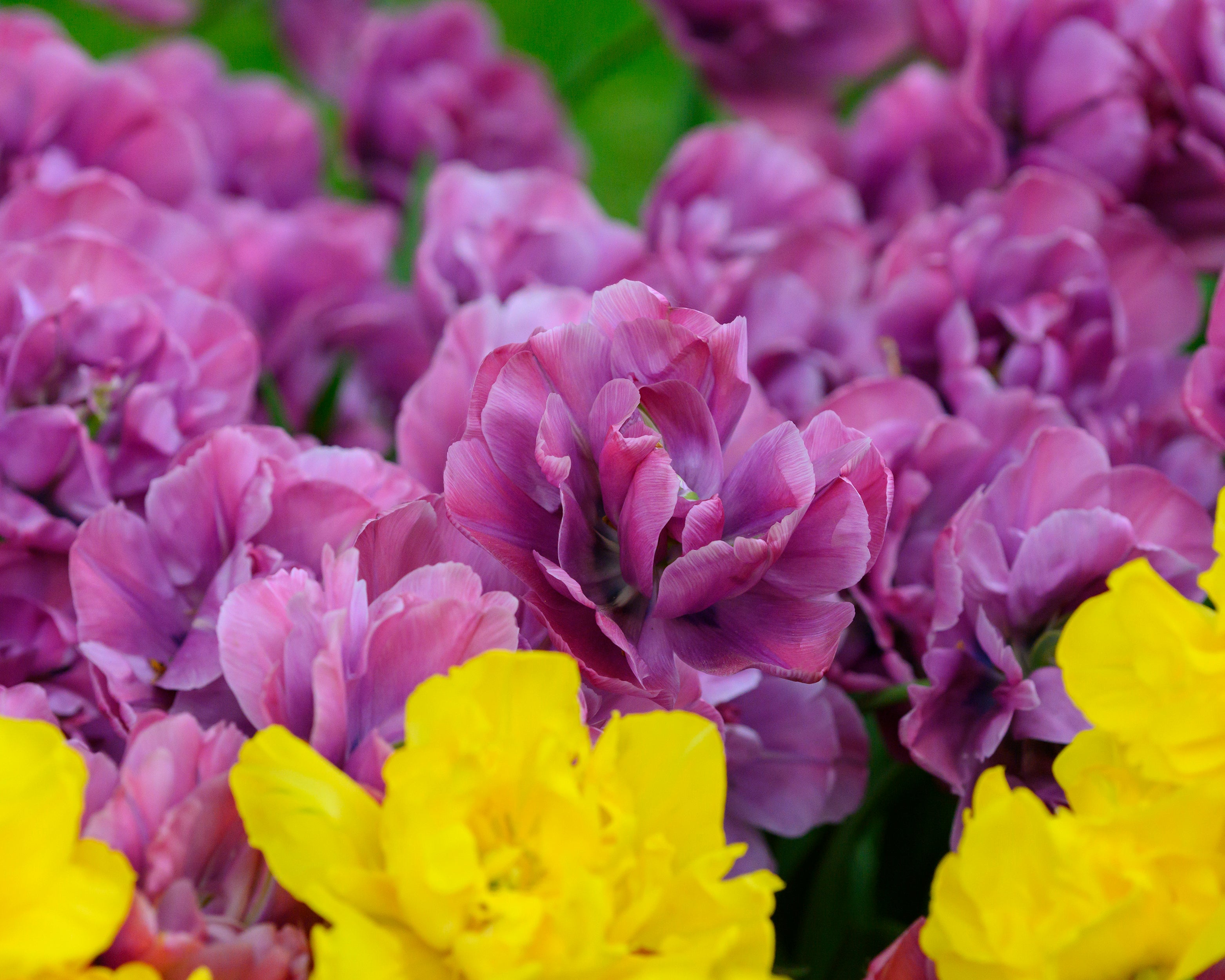 As part of the peony-group of tulips, known for their generous double blooms that resemble peonies, Tulip 'Rosy Diamond' is impactful yet, unlike real peonies, has a very long flowering period. Seeing its colours transform over time adds an element of surprise and mystery to the garden. Standing at around 45cm high, Tulip 'Rosy Diamond' also works very well in pots. Her delightful colours would create a stunning match with blues, pinks or violets, for example with Dicentra or Muscari mixed with other vibrant late-flowering tulips.