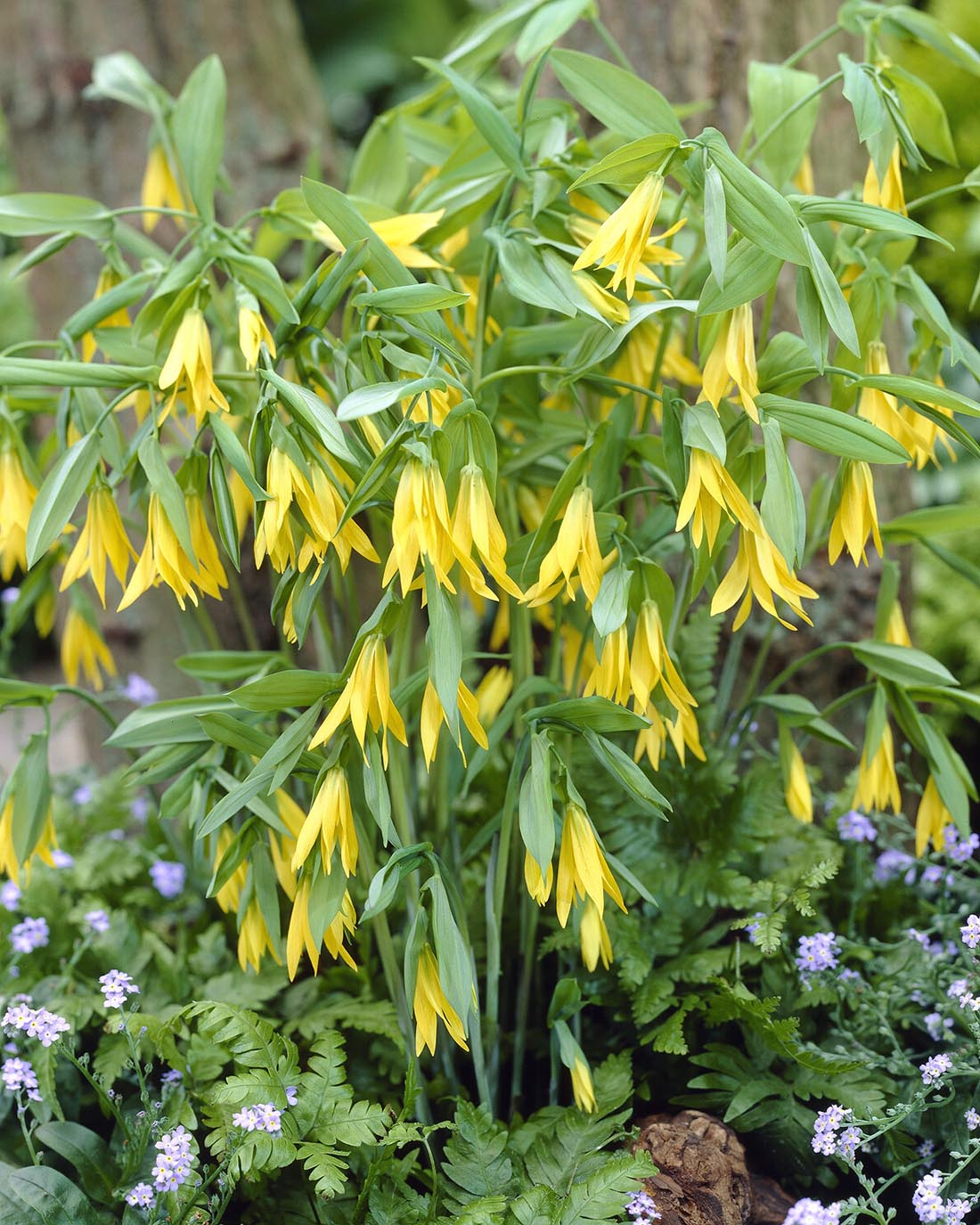 Perfect for woodland borders, shady beds and informal garden corners, Uvularia grandiflora thrives in moist, humus-rich soil and partial shade, where it will gently settle in and return faithfully each year. The Wisley Strain bellwort is especially well regarded for its vigour and flower quality, making Uvularia grandiflora a sound investment for patient gardeners who value longevity over instant impact. It pairs beautifully with ferns, spring ephemerals and early bulbs, weaving through planting with a relaxed, almost conversational presence. Once established, it asks very little, preferring to be left undisturbed to form loose, elegant clumps. Uvularia grandiflora brings a calm, woodland rhythm to the garden, offering spring interest that feels both timeless and quietly uplifting.