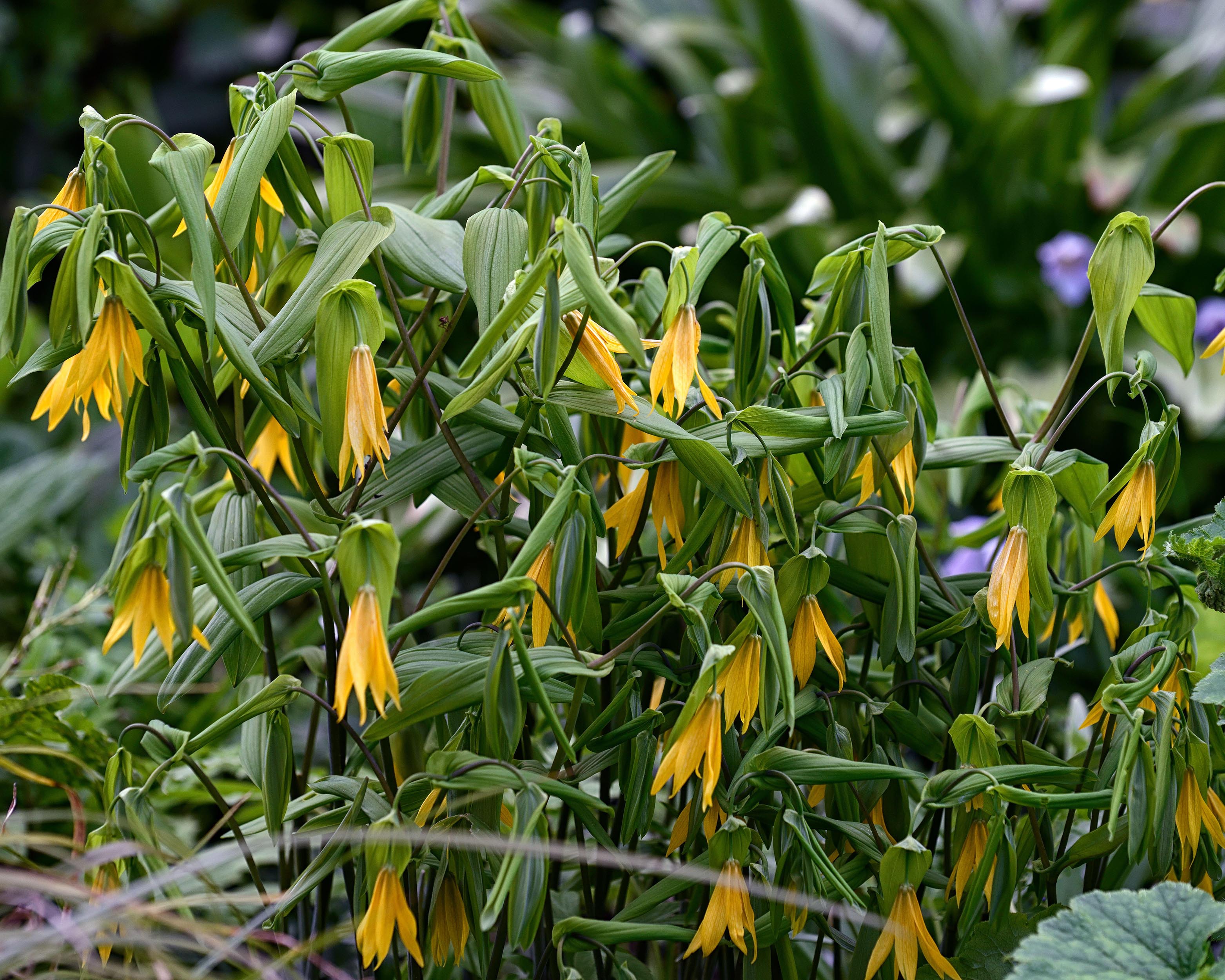 Bellwort refers to the flower shape, while Uvularia comes from the Latin for little hanging throat.