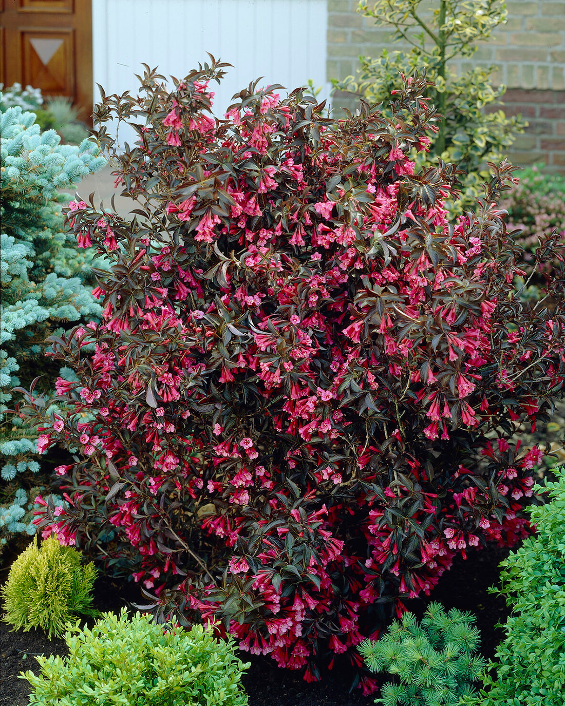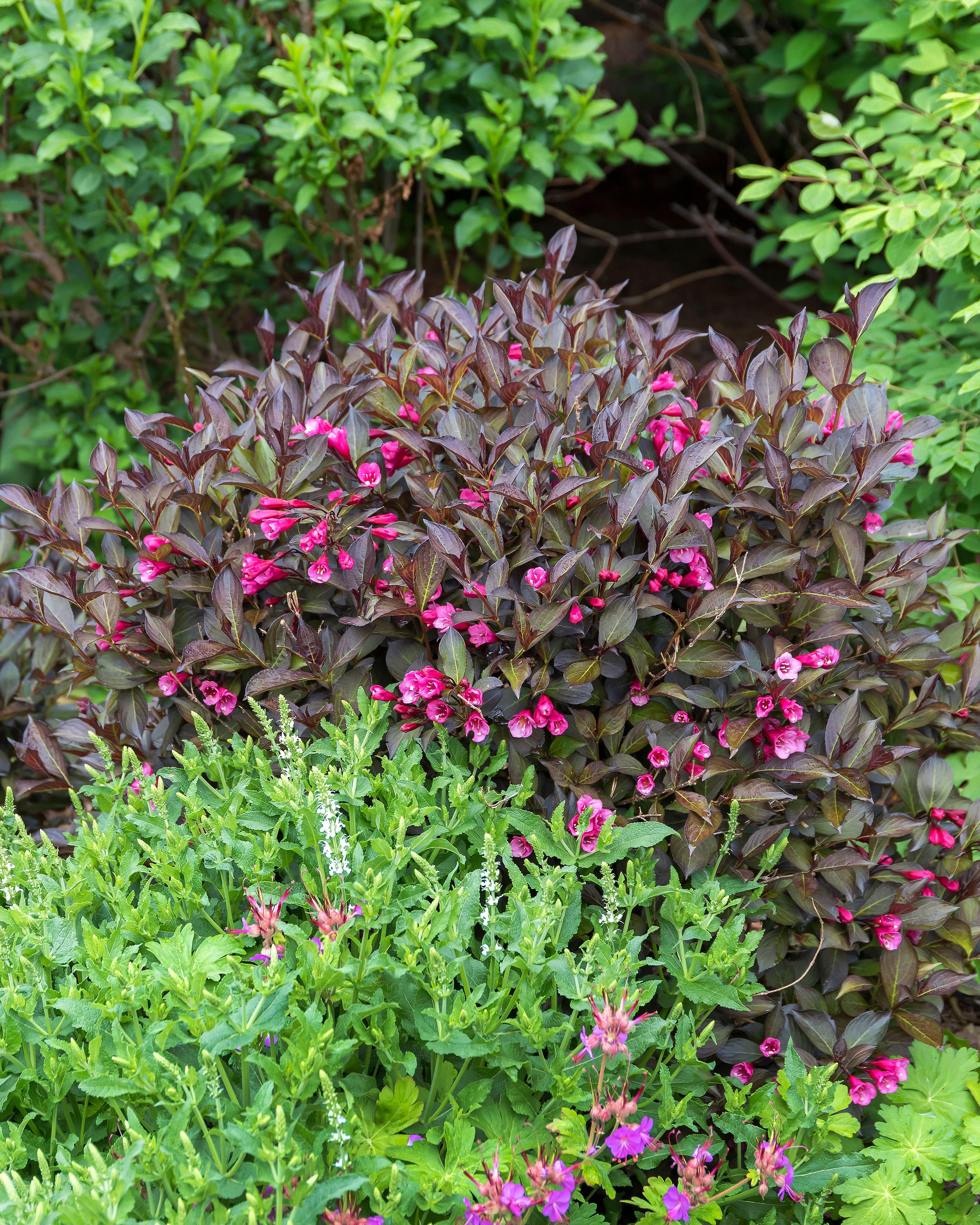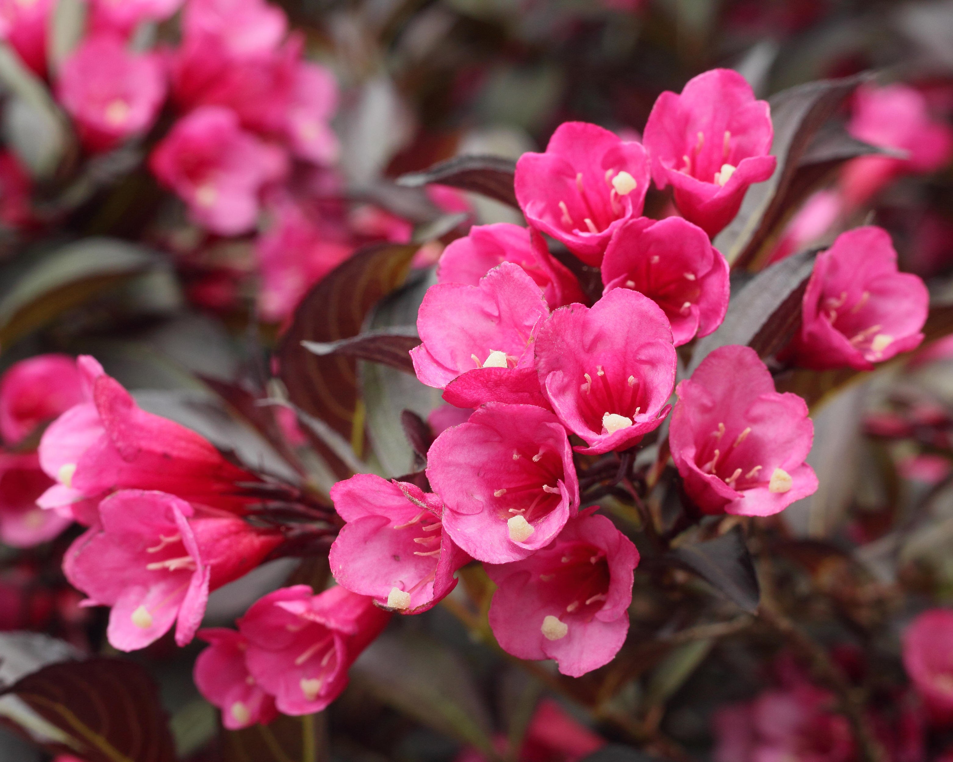 Weigela 'Alexandra' proves that some classics never go out of style—they just find better lighting. This old-fashioned weigela, with its dense, rounded form and deep bronze-purple foliage, adds a moody richness to the garden that lasts from spring right through autumn. The leaves darken beautifully as they mature, creating a dramatic backdrop for its clusters of reddish-pink, trumpet-shaped blooms that burst into life in late spring and early summer. The contrast between the dusky foliage and bright flowers is enough to stop you mid-watering-can, while the nectar-rich blooms of Weigela 'Alexandra' are a hit with pollinators who’ll visit daily for their sugary fix.